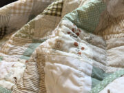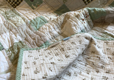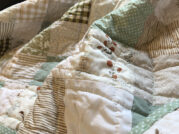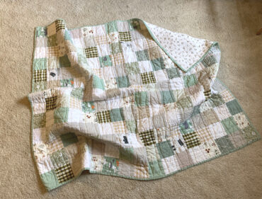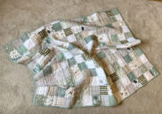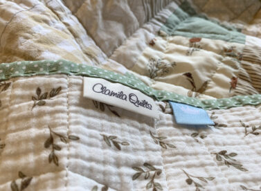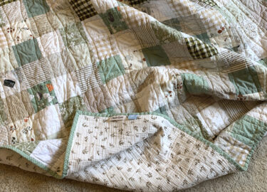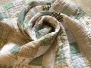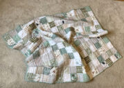 Tadaaa, natürlich habe ich ein bisschen was genäht, diesen süßen kleinen Babyquilt. Helle Grüntöne treffen auf beige und creme, soo cozy das kleine Ding. Auf der Rückseite ist ein kuscheliger Musselinstoff mit Ästen als Motiv.