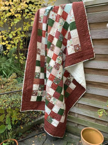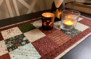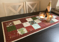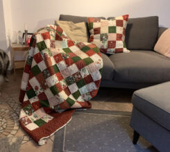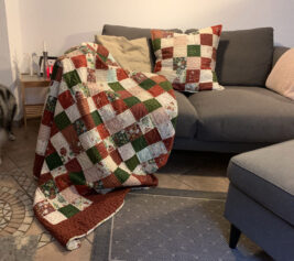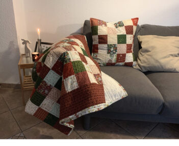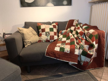 Ich habe mich für ein einfaches traditionelles Patchworkmuster mit einem Border entschieden. Ich finde das passt einfach zum Stil der Prints. Da ich genug Stoffe hatte, hab ich auch wieder ein Kissen und einen Tablerunner genäht. Auf der Rückseite habe ich ein Microfleece in wollweiß verarbeitet, dadurch ist der Quilt unglaublich kuschelig und weich ![]()
