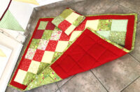 Die Krabbeldecke ist 100 x 130 cm und die kleine Kuscheldecke hat 55 x 75 cm. Die kleine Decke hat einen uni roten Fleecerücken, perfekt zum Einkuscheln.