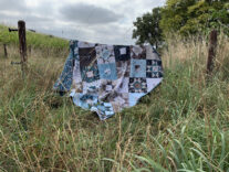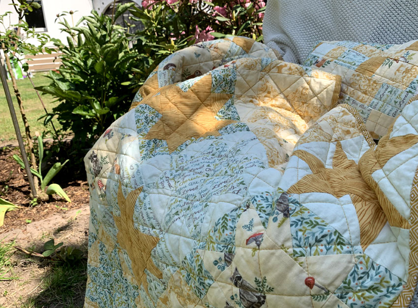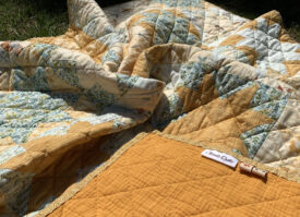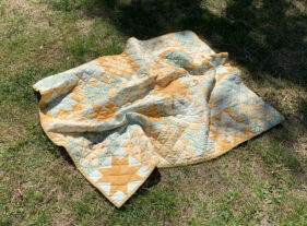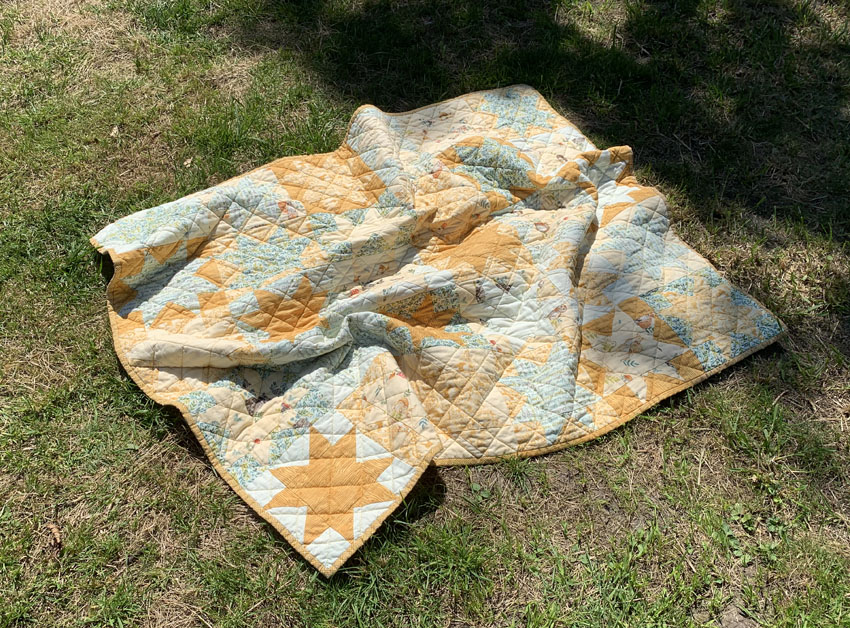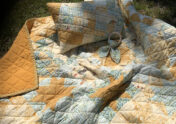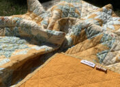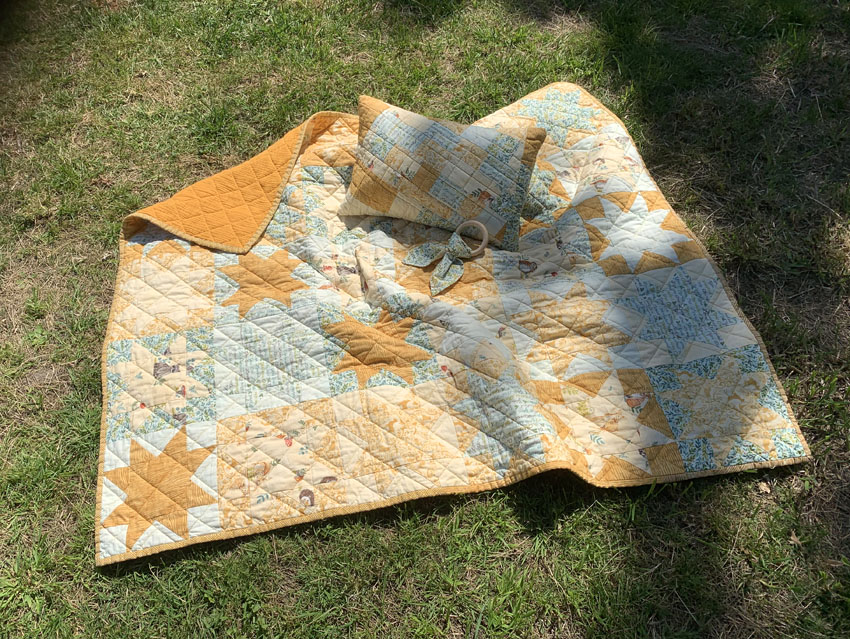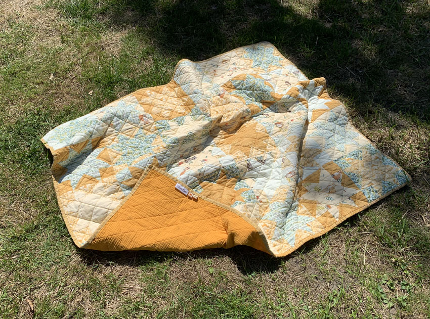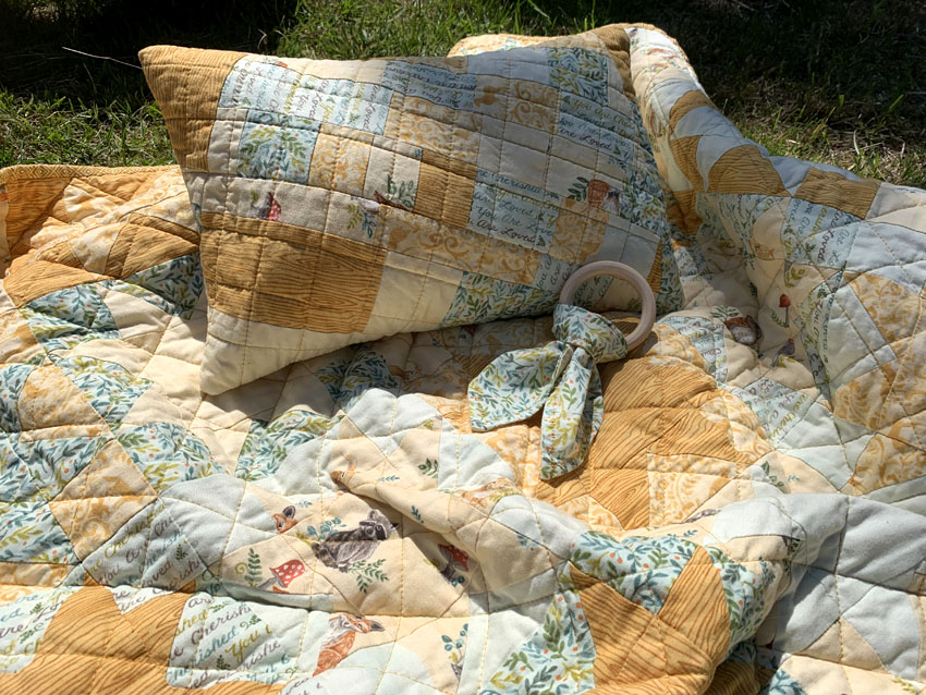 Zum Glück gibt es ja bald Nachwuchs in der Familie, so dass der kleine Quilt gleich einen Abnehmer gefunden hat. Auf der Rückseite habe ich einen kuscheligen Musselin in senfgelb verarbeitet. Gequiltet habe ich diagonale Rauten und aus den Resten wurde noch ein kleines Kissen genäht.