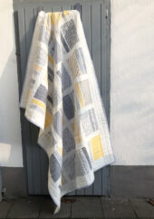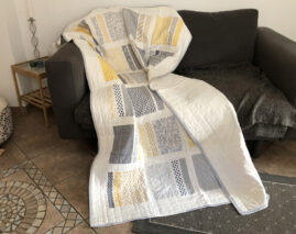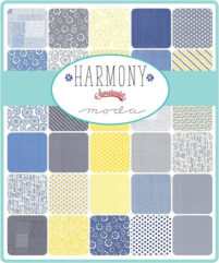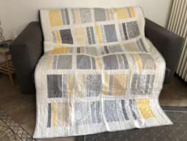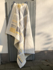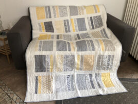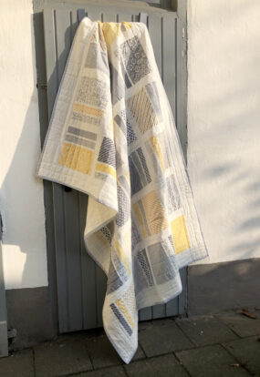 Letztendlich entschied ich mich fĂŒr die Stoffserie ‚Harmony‘ und habe dort einige der knallblauen Stoffe aussortiert, um im Quilt möglichst nur gelb und grau zu verwenden, oder zumindest sehr wenig blau. Das Sashing ist weiĂ, die RĂŒckseite ebenso.