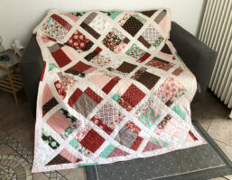 Zunächst dachte ich, ich nähe die Blöcke einfach in Reihe nebeneinander, doch dann erschien mir das zu eintönig. Deshalb hab ich die Blöcke zusätzlich wie bei der Lattice Pattern diagonal mit zusätzlichem cremeweißen Sashing arrangiert und ich denke, das war eine gute Entscheidung. Auf der Rückseite ist ein hell rosa Stoff mit Rautenmuster und ein Streifen des restlichen Hasenstoffs.