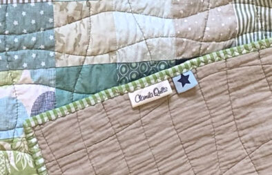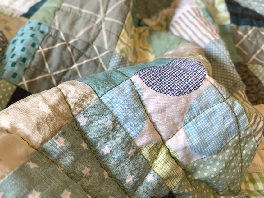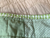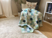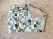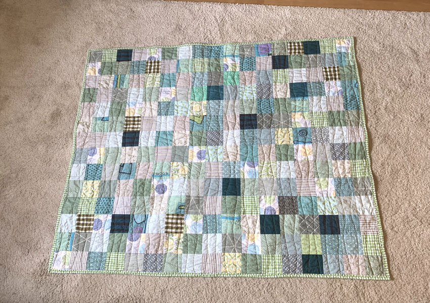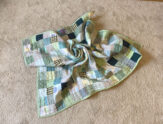 Ein kleiner Quilt zum Spielen und Kuscheln, in klassischem Patchworkmuster in den Farben grün und bisschen blau, auf der Rückseite ist ein beiger Musslin.