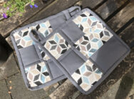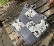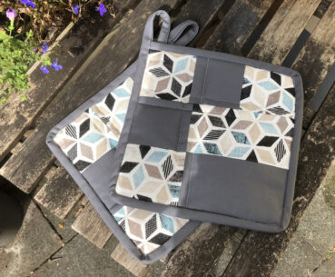 Die Topflappen waren ein Geburtstagsgeschenk für Jana, im August. Dachte ich zeig sie trotzdem mal, im Grunde sind es auch wieder Restelappen. Ich hab einfach die Stoffe vom Hundekissen nochmal verwurschtelt.