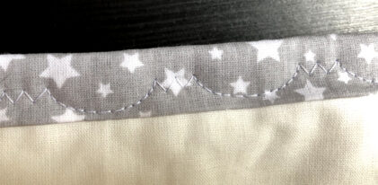 Gequiltet habe ich, wie beim Christmas Quilt , gerade Linien mit dem Wellenstich, entlang der Blöcke und Nähte.