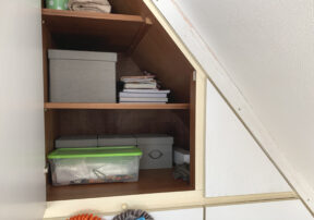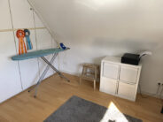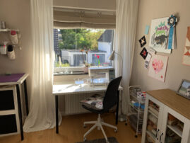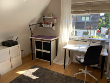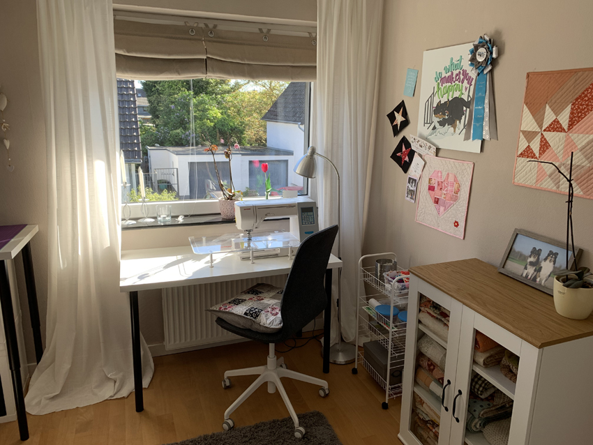 Ich bin so happy mit meinem neuen Raum, endlich Platz, um die Nähmaschine direkt vors Fenster zu stellen. Der Raum ist schön groß, ich kann das Bügelbrett einfach stehen lassen und im Wandschrank ist zusätzlicher Stauraum für Stoffe und Zubehör.
