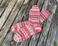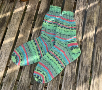Leider hab ich nicht alle fotografiert. Ich hab mich mal an 3 unterschiedlichen Mustern probiert; Schüppchen, Charade und Minecraft. Verwendet habe ich Wolle von Opal, MEILENWEIT von Lana Grossa und ein Woll Butt Sockenwollpaket „Erdbeerfeld“.