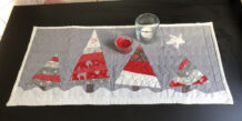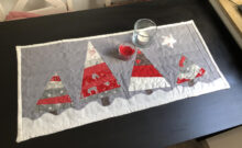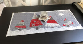 Leider hab ich für den grauen Hintergrund und den Schnee einen blöden Dekostoff genommen, der noch hier rum lag. Deshalb ist der Tablerunner bisschen wellig, lies sich nicht glatt bügeln und das Binding hat mit dem dicken Stoff auch nicht so toll geklappt, die Ecken sind nix geworden. Gefallen tut er mir trotzdem, beim nächsten mal wird es bestimmt besser. Man lernt ja jedesmal etwas dazu ![]()