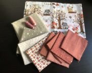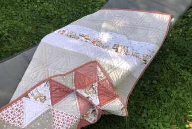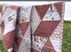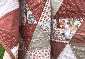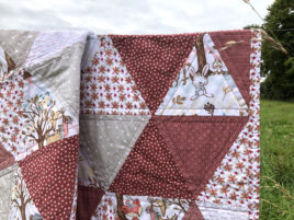 Dieser super süße Triangel Quilt ist für ein kleines Mädchen, dass hoffentlich gesund im November geboren wird. Die zukünftige Tante hat sich die Farbombination rund um den kleinen Fuchs und seine Freunde selbst ausgesucht.