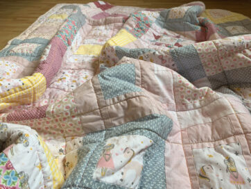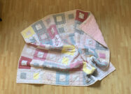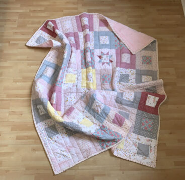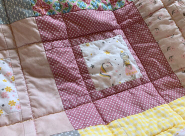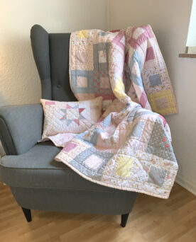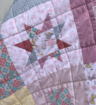 Der kleine Quilt hier ist ca 1,20 x 1,38 m, damit kann sie sich ohne Probleme die ersten Jahre einkuscheln. Als Zugabe gibt es ein passendes kleines Kissen. Auf der Rückseite ist wieder ein kuscheliges Wellnessfleece in rosa.