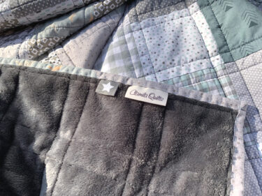 Wir haben uns für ein einfaches Patchworkmuster entschieden, die Quadrate sind 4″ groß im genähten Zustand. Ich habe helle Stoffe in grau mit ein wenig blau verarbeitet. Auf der Rückseite ist in kuscheliges Fleece in einem dunkleren Ton. Der Quilt hat eine Größe von 145 x 175 cm.