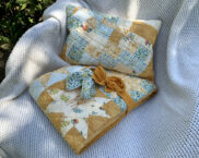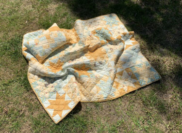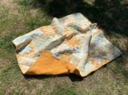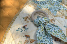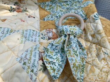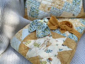 Zum Glück gibt es ja bald Nachwuchs in der Familie, so dass der kleine Quilt gleich einen Abnehmer gefunden hat. Auf der Rückseite habe ich einen kuscheligen Musselin in senfgelb verarbeitet. Gequiltet habe ich diagonale Rauten und aus den Resten wurde noch ein kleines Kissen genäht.