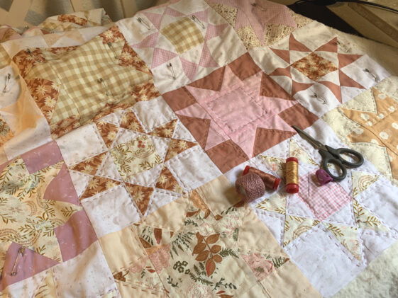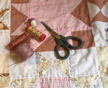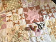 Mein ‚Mom and Pop Quilt‘ wird komplett mit der Hand gequiltet, so ist der Plan. Keine Ahnung warum ich mir fürs erste Mal direkt so ein großes Teil ausgesucht habe, aber jetzt ist es so und irgendwann wird er fertig werden, da bin ich sicher. Aktuell hab ich 13 von 56 Blöcken geschafft.