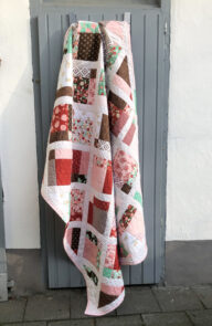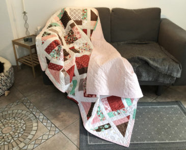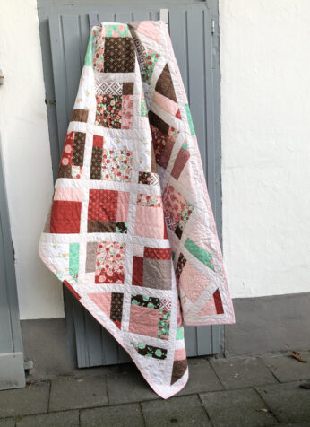 Zunächst dachte ich, ich nähe die Blöcke einfach in Reihe nebeneinander, doch dann erschien mir das zu eintönig. Deshalb hab ich die Blöcke zusätzlich wie bei der Lattice Pattern diagonal mit zusätzlichem cremeweißen Sashing arrangiert und ich denke, das war eine gute Entscheidung. Auf der Rückseite ist ein hell rosa Stoff mit Rautenmuster und ein Streifen des restlichen Hasenstoffs.