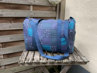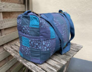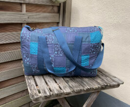 Dies ist meine zweite Tasche nach dem Patchwork Duffle Schnittmuster. Jana wollte unbedingt etwas in blau, leider sah unsere erste Farb-Variante ziemlich grauenvoll aus, so dass ich die unfertigen Teile monatelang im Schrank liegen hatte. Dann beschloss ich neue Stoffe zu kaufen und den Rest aufzutrennen, um wenigstens das Vlies und die blauen Gurtbänder verwenden zu können. Irgendwie ist es schwer mit blau, finde ich zumindest, unterschiedliche Blautöne harmonieren nur sehr schlecht miteinander. So passt auch das Gurtband farblich immer noch nicht so ganz. Aber im Großen und Ganzen bin ich recht zufrieden mit meiner neuen Version.