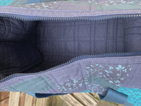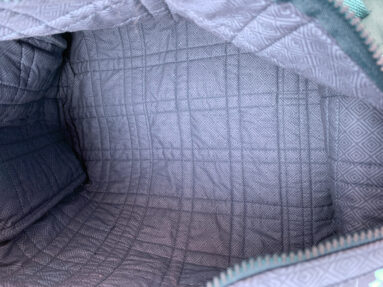 Technisch ist sie mir besser gelungen als die Erste, da ich die möglichen Fehlerquellen nun schon kannte. Z.B. hab ich die Seitenteile etwas größer gemacht, als im Schnitt angegeben, weil die bei der ersten Tasche nicht passten, da waren sie zu klein und es gab Falten beim einnähen.