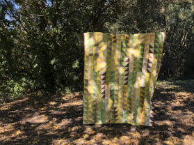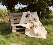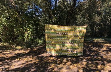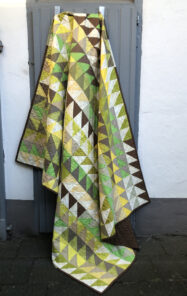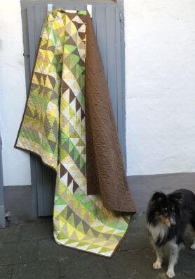 Ursprünglich geplant als Backyard Party Quilt, wurde es dann spontan eine ganz andere Pattern, diese nennt sich „Tea Time“ und besteht aus über 300 HST. So viel bügeln und cutten, ich war froh als die einzelnen Teile soweit fertig waren und nur noch zusammen genäht werden mussten. Der Quilt sollte groß sein, so dass er als Bettüberwurf für ein 1,40 x 2,00 m großes Bett benutzt werden kann und das ist er nun auch. Er misst 67″ x 85″ (1,70 x 2,15 m). Für die Fotos mussten meine beiden Töchter helfen, für einen alleine ist das Ding zu groß ![]()